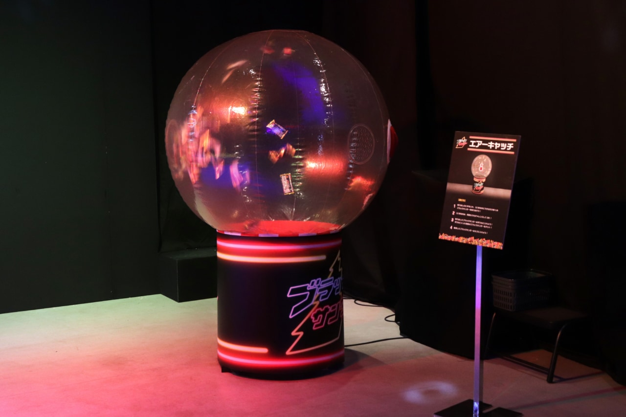 続いては、お祭りの屋台でも見かけるエアーキャッチくじがイベント会場に登場。お祭りではつかんだくじの番号によって景品が変わりますが、今回バルーン内に飛んでいるのはブラックサンダーの空袋で、制限時間15秒の間はつかんだ分が何個でも景品としてプレゼントされます。