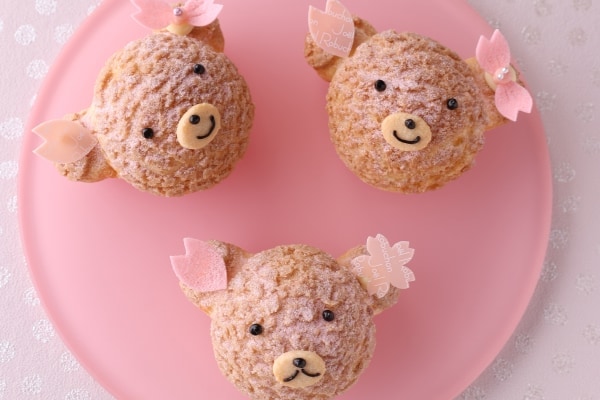 「クマさんシューさくら」は、桜とリボンの耳飾りをしたクマをかたどったプチガトーの新作。桜の葉で香りをつけたクレームシャンティに花びらの香りのクレームパティシエールを合わせ、グリオットチェリーのコンフィチュールを忍ばせました。シュー生地まで桜の香りが楽しめます。