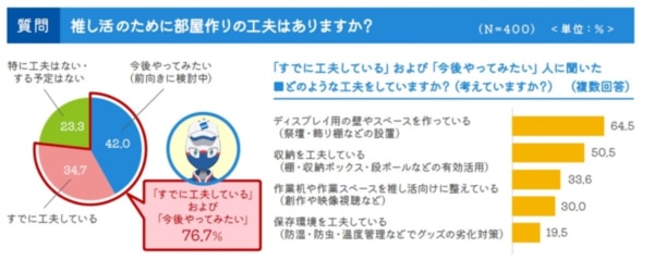 さらに、推し活のための「部屋を作っている人」「部屋作りをやってみたい(検討している)人」は76.7%でした。推し活が生活の一部として深く根付いている実態が垣間見えました。