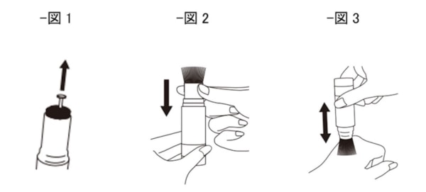 (3)ブラシ先端にパウダーが出てくるまで、手の甲、またはティッシュペーパー等にブラシをあて軽くトントンとたたき、十分にブラシにパウダーを含ませます。(図3)