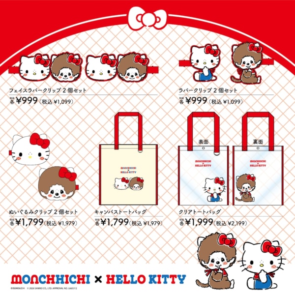 おそろいの赤いリボンをつけたモンチッチとハローキティがとってもかわいい、デザインを用いたTシャツ・パーカー、ショートパンツ、長袖ジャージ上下セットの7アイテムを発売。