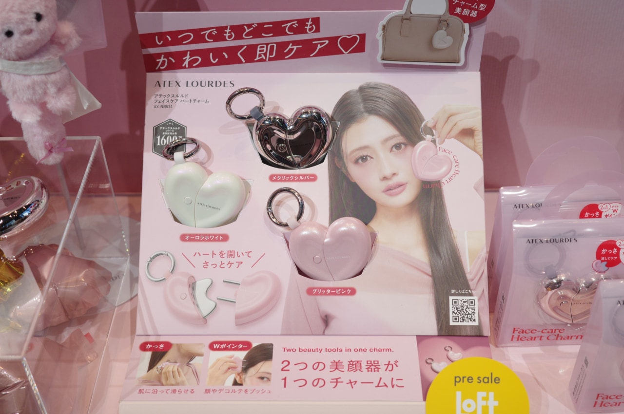 最近ではチャーム付きでバッグなどにつけられるコスメがトレンドとなっていますが、その流れが美容機器にも。アテックスルルドの「フェイスケア ハートチャーム(4,950円)」は、ハート型のかわいい見た目でありながら、カッサとWポインターの2つの機能が1つになった多機能美容ツールです。