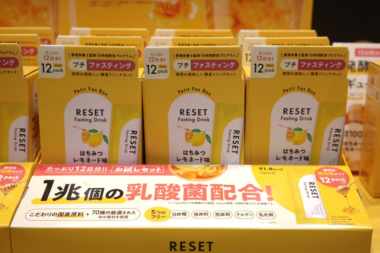 お腹の調子をすっきりさせたい人に試してほしいのが酵素ドリンクの「RESET」。はちみつレモネード味のおいしいドリンクに1食を置き換えるだけで、プチファスティングがかなうというアイテムです。乳酸菌が配合されていて、腸活とファスティングの相乗効果を狙えるのだとか。