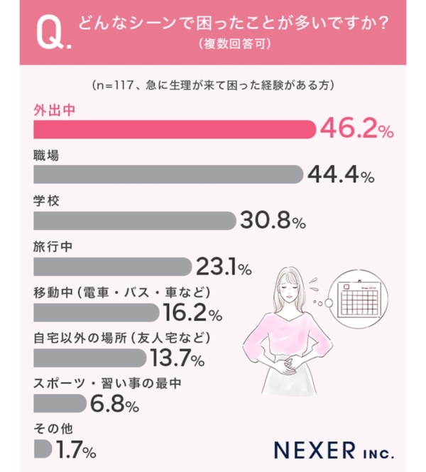 NEXERはこのほど、Angelite(アンジェライト)と共同で、全国の女性200名を対象に「急な生理の経験について」のアンケートをおこないました。