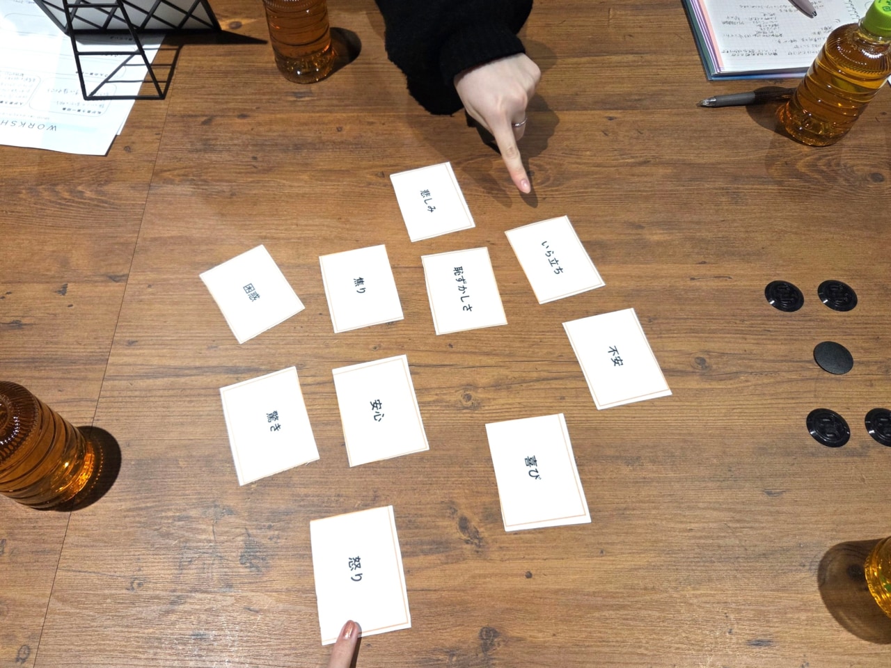 最後に、表情のみで相手の感情を読み取るゲームで表情の重要性をおさらい。身振り手振りは無しで、引いたカードに記載された感情を演じる表情のみで、相手がどんな感情を表しているのか考えます。演者はOriさん。