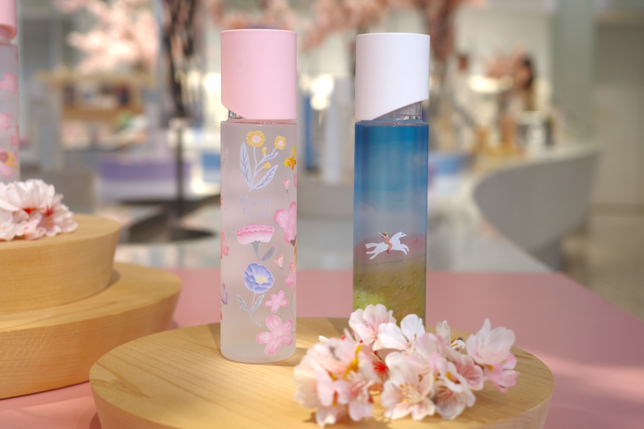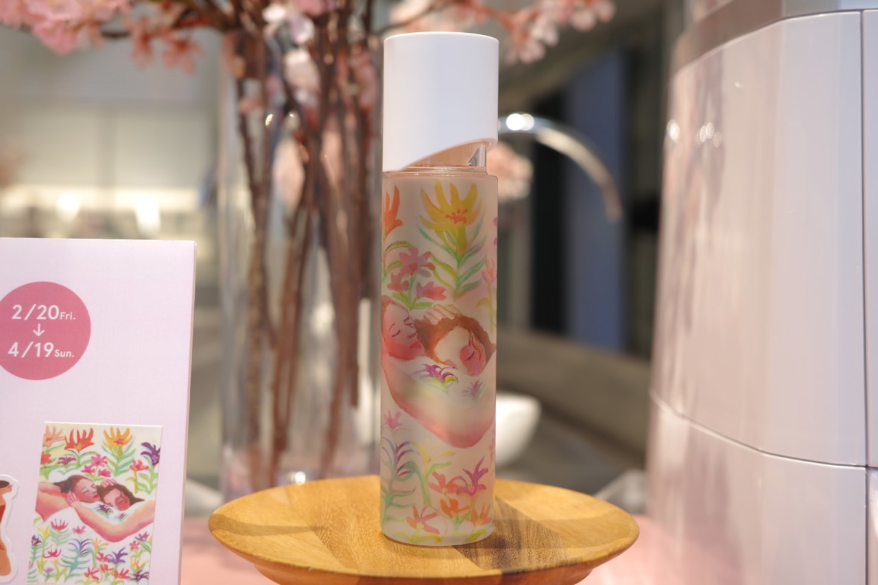 桜でいっぱいの店内は、まるでここだけ先に春が訪れたよう! 田中マリナさんとコラボレーションしたデザインの 『CREATE BOTTLE』が、店内に入ってすぐ飾られていました。