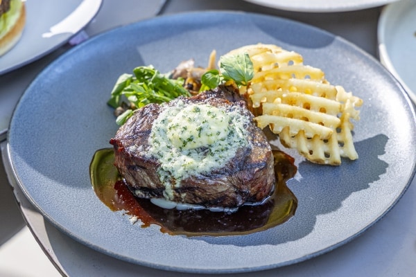 食事には、真鯛の鉄板グリルや豚肩ロース肉のグリル、ビーフバーガーなどが楽しめます。
