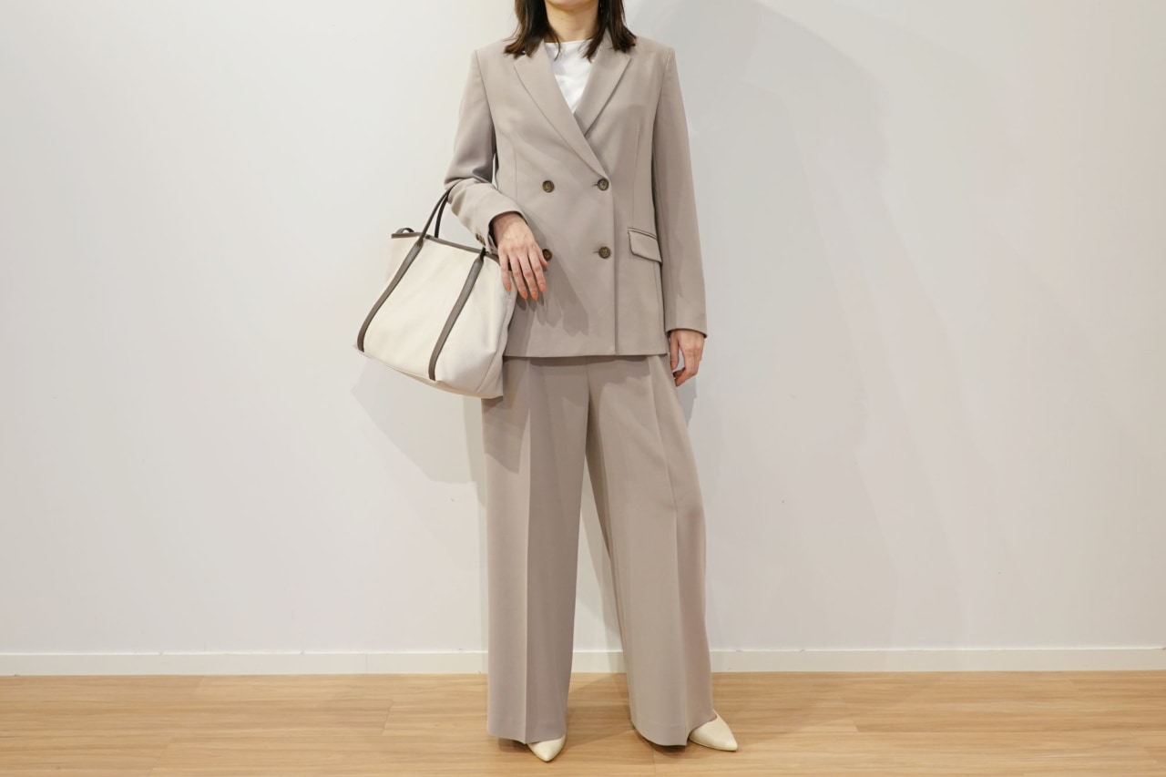 「トリアセブレンドダブルジャケット」(34 ベージュ 23,000円)、「トリアセブレンド2タックワイドパンツ」(34 ベージュ 15,000円)、「グロスジャージーレイヤードインナー(カフスコンビ)」(00 ホワイト 6,990円)、「フェイクレザーパイピングトートバッグ」(32 ベージュ 8,990円)