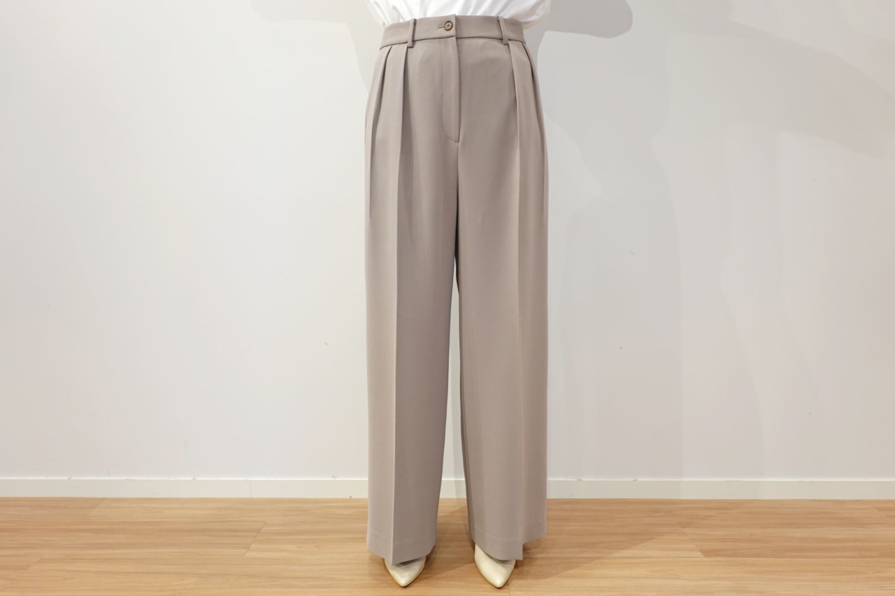 同じくグレージュカラーの「トリアセブレンド2タックワイドパンツ」は、ワイドながらも横に広がらず、すとんと落ちるシルエットの2タックワイドパンツ。センタープレスと高めのウエスト位置で脚長効果もありながら、クリーンな印象をプラスします。きちんと感があるのに、ウエスト部分は平ゴムが入っていて快適な着心地。会食がある時もこのパンツならお腹周りも快適に過ごせそう!