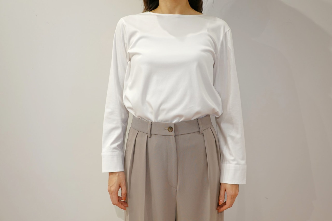インナーには、一枚でもレイヤードでも着回せる「グロスジャージーレイヤードインナー(カフスコンビ)」を選びました。上品な微光沢と落ち感があるジャージー素材のインナーは、背中と袖部分にハリ感のあるタイプライター生地をドッキングしていて、シャツライクなデザインになっているんです。