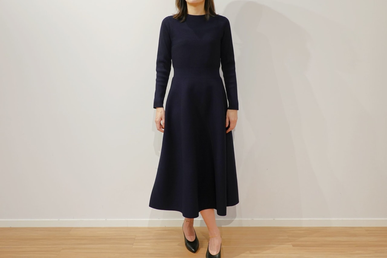 二つ目のコーディネートは、エレガントに決めたいときにたった一枚で華やかさを演出するワンピーススタイルです。立体的なシルエットでエレガントな雰囲気を醸し出す「ホールガーメント®フレアニットワンピース」は、ウエスト部分がリブ編みになっており、腰の位置を高く見せるので着るだけで体のラインがきれいに見えます。