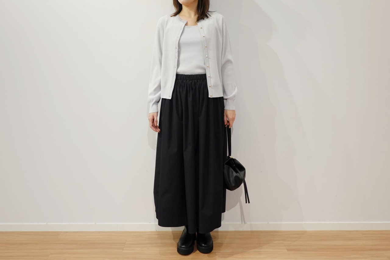 「UVカットレーヨンブレンドメタルボタンカーディガン」(03 グレー 7,990円)、「UVカットレーヨンブレンド2WAYネックタンクトップ」(03 グレー 4,990円)、「ギャザーボリュームスカート」(09 ブラック 9,990円)、「トライアングルミニバッグ」(09 ブラック 7,990円)