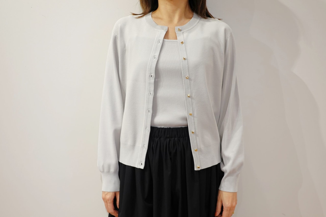 「UVカットレーヨンブレンドメタルボタンカーディガン」は、すっきり見えるコンパクトなシルエットに華やかで上品なメタルボタンがアクセントのカーディガンです。さらっとした風合いで通気性も良く、羽織りやボタンを閉めてプルオーバーにするなど春夏に活躍すること間違いなし!