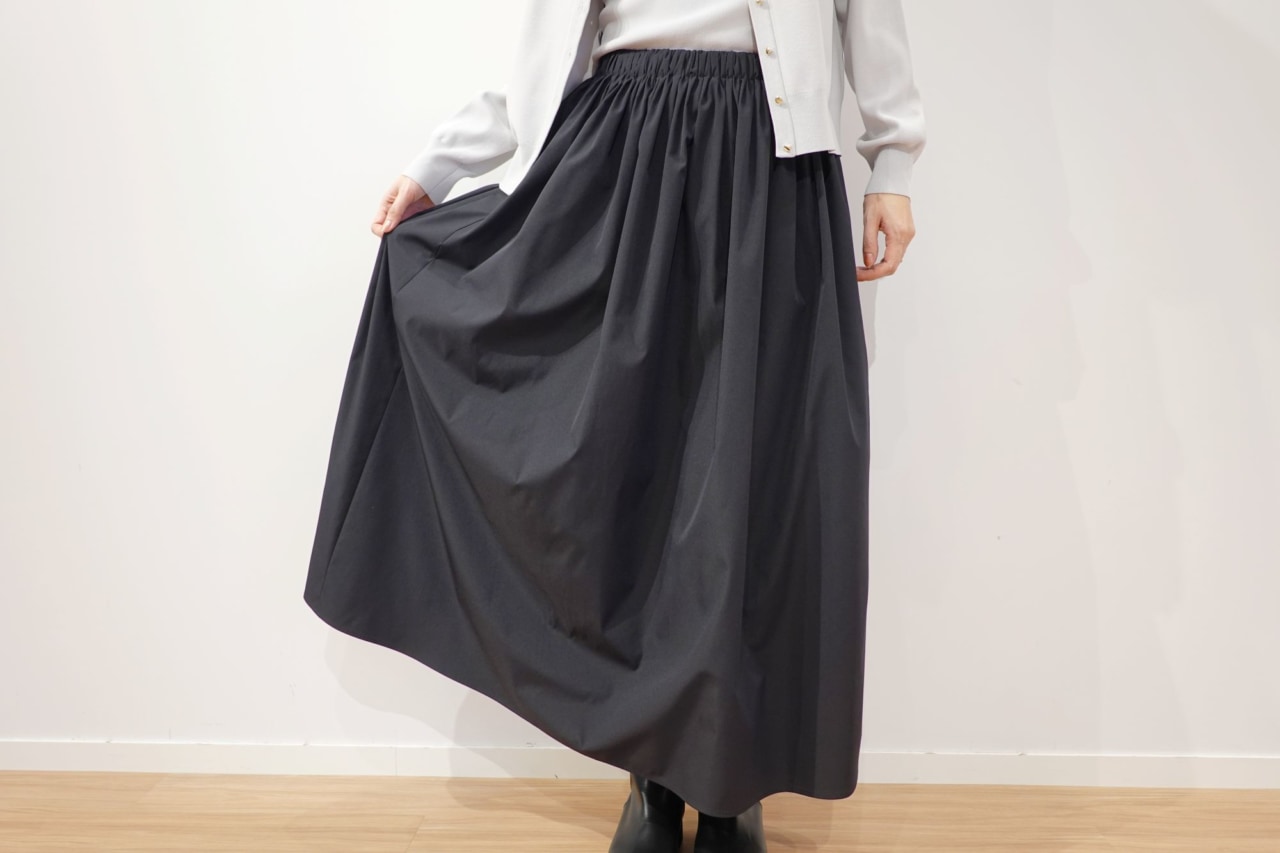 合わせた「ギャザーボリュームスカート」は、シルエットがとにかく美しい! タックとギャザーを組み合わせたボリューム感のあるスカートは、動くたびにふわっときれいに広がります。両サイドにある大きめのポケットは、前向きについているので手を入れやすく、タックにより目立ちにくいデザインに。