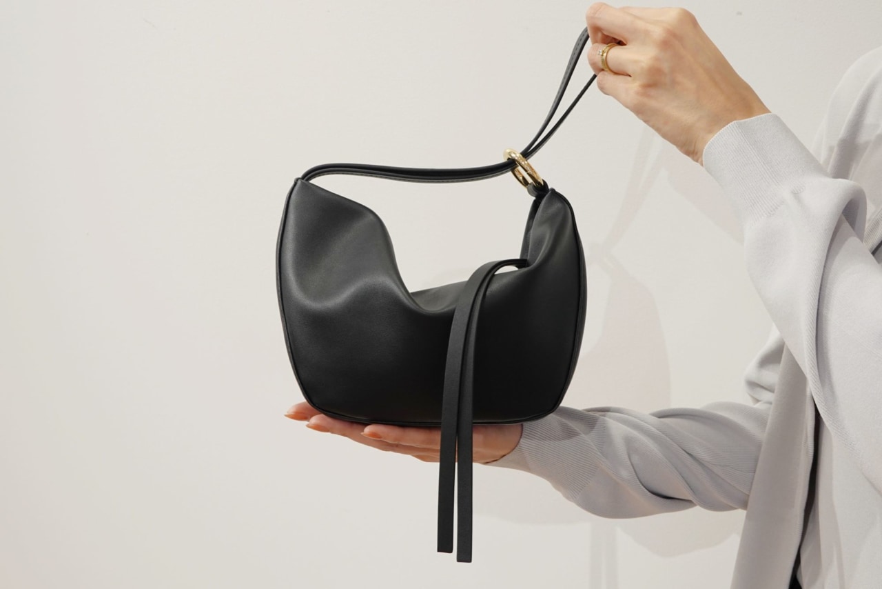 オフの日は、トライアングル型のフォルムがかわいい「トライアングルミニバッグ」を合わせれば、シンプルな装いのワンポイントとなりますよ。