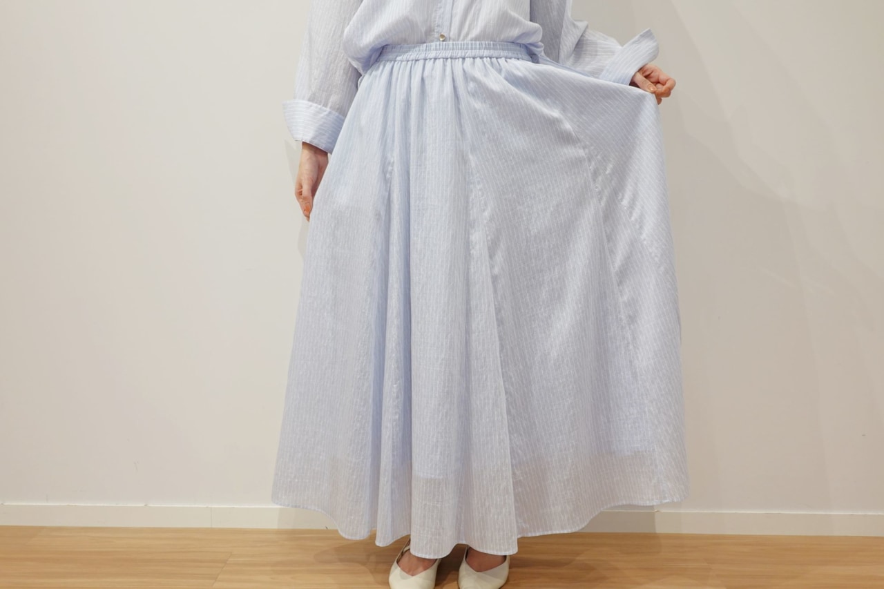 合わせた同素材の「シアーボリュームフレアスカート」は、裾に向かってマチが入り、裾周りにボリューム感を持たせたスカートです。ウエスト周りは適度なゴム仕様によって履き心地が良く、縫い目に沿った大きめのポケットにはスマホもすっぽりと収まります。