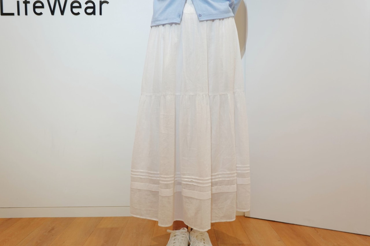 「ティアードマキシスカート」は、裾にタックデザインが施されていて存在感抜群! コットン100%のソフトなタッチで、夏本番まで活躍すること間違いなしの一枚です。一体型の裏地がついているので、インナーが透けてしまう心配もありません。