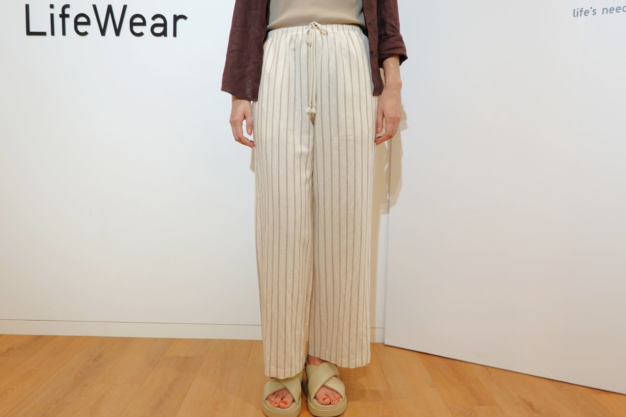 リネンの清涼感を活かした「ネンブレンドイージーパンツ」は、細幅のウエストゴムですっきりとした印象に。外側のスピンドルコードで、ウエストを調整できるので快適に過ごせますよ。