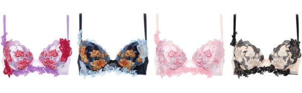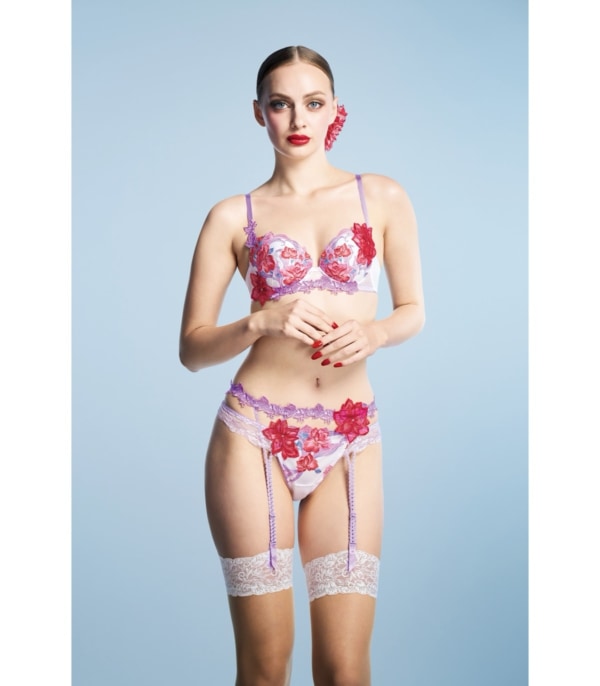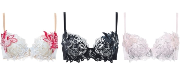 バストボリュームを脇から中央に寄せ、きれいな谷間をつくるサルート定番のブラジャー。存在感のあるアップリケは、鮮やかなパティオで美しく咲くクレマチスの花をイメージしました。土台下辺と右ストラップにほどこされたエレガントな刺繍レースがアクセント。