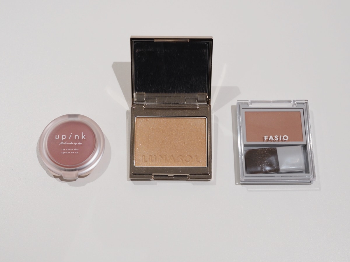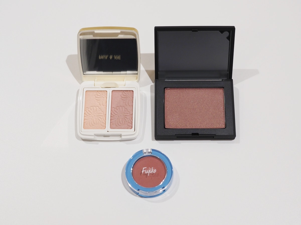 よしかわ:だいぶ味がある表現だけど、まさにそう(笑)。オレンジやブラウンばかり手に取りがちだったから新たな挑戦です。NARSの「ブラッシュ N 907 MAD LOVE」はリアルな血色感をシアーにまとえるカラーで、ゴールドパールも合わさってヘルシーな印象に、Fujikoの「どこでもチーク 00 ちょい悪ローズ」はやや青みがあるぽわんと発色でかわいらしい印象になれます。