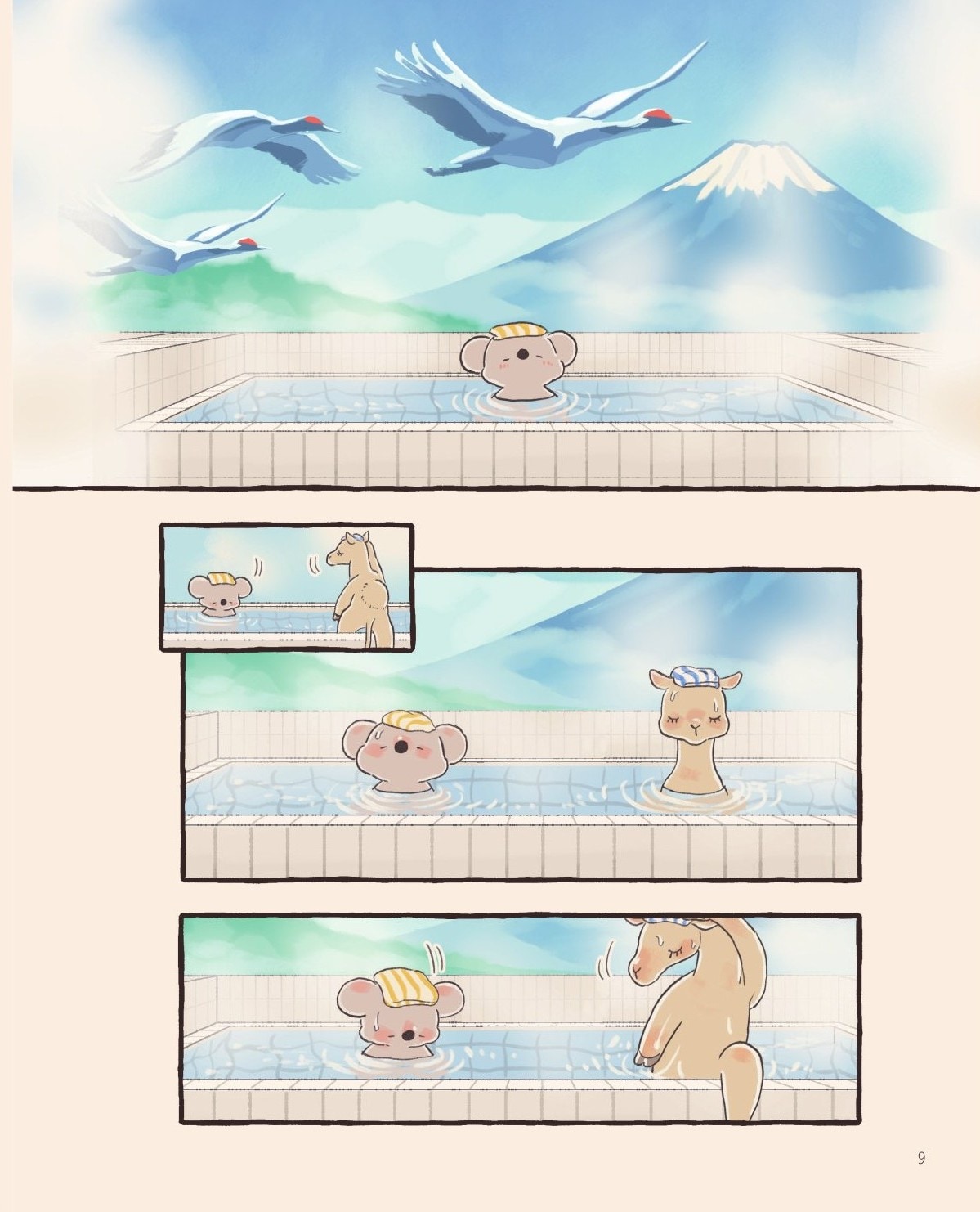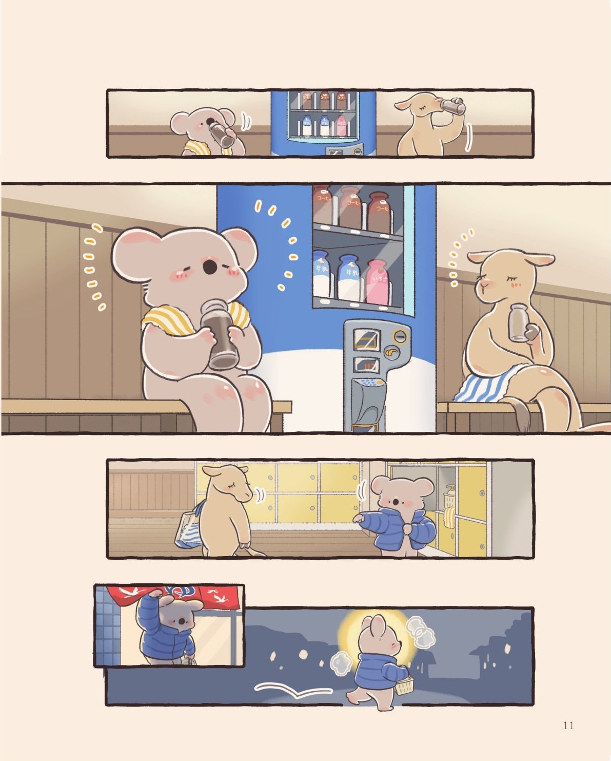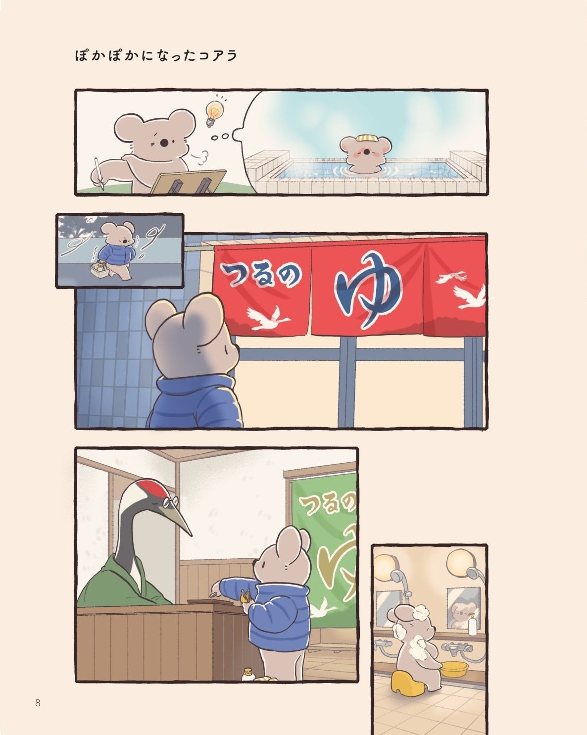 銭湯の大きなお風呂でゆったりくつろぐコアラさん。知らない人とのささやかな交流も、心があたたかくなります。まだまだ朝晩の冷え込みが続く季節、今日はゆっくりお風呂に浸かって、体も心もゆるめてみようかなあ。