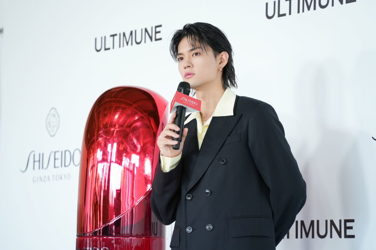 続いて、フォトコールに登場した佐野勇斗さん。今回のポップアップストアを見た感想を問われると、「すごく新鮮でおもしろかったです」と話し、アルティミューンの魅力についても「実際に朝メイクをする前に使わせていただいたんですけど、本当にお世辞抜きで驚いた。サラサラしてるのにすごく肌に浸透している感じ。本当に肌に悩んでいる方はぜひ一度使ってみてほしい」とアピールします。