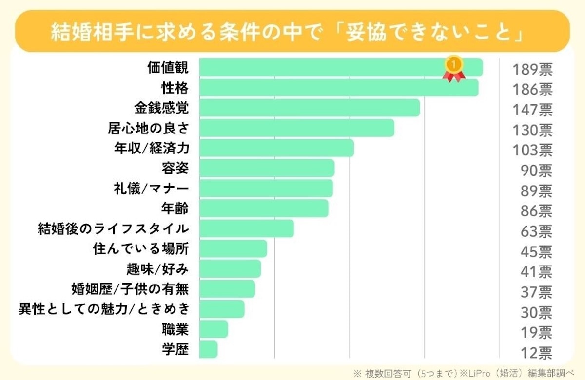 妥協できない条件として最多を集めたのが「価値観」の189票、2位は「性格」で186票。次いで「金銭感覚」「居心地の良さ」「年収/経済力」と続きます。