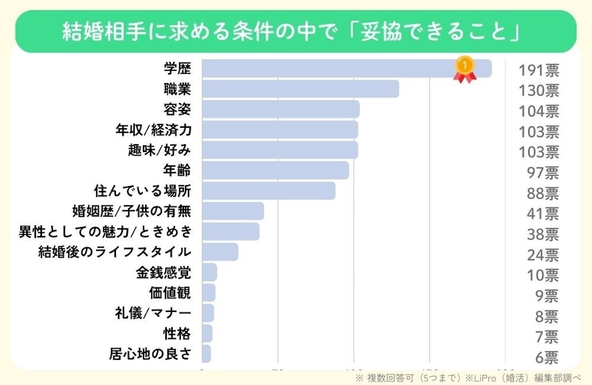 反対に、妥協できる条件の1位となったのが「学歴」で191票。2位が「職業」で130票、その次は「容姿」「年収/経済力」「趣味/好み」がほぼ同数で続いています。