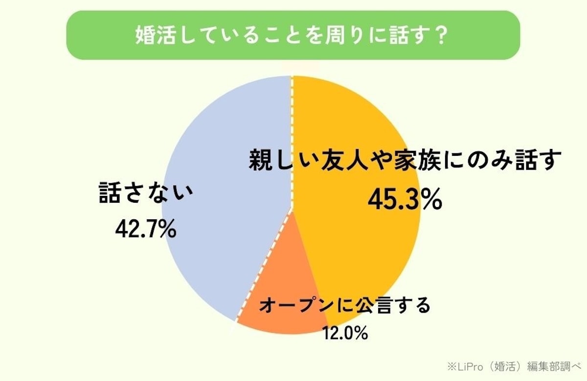 「親しい友人や家族のみに話す」と回答した人が45.3%で最多に。「話さない」と答えた人は42.7%、「オープンに公言する」と答えた人は12%です。話すか話さないかで分けると、話す:話さない=6:4という結果となっています。