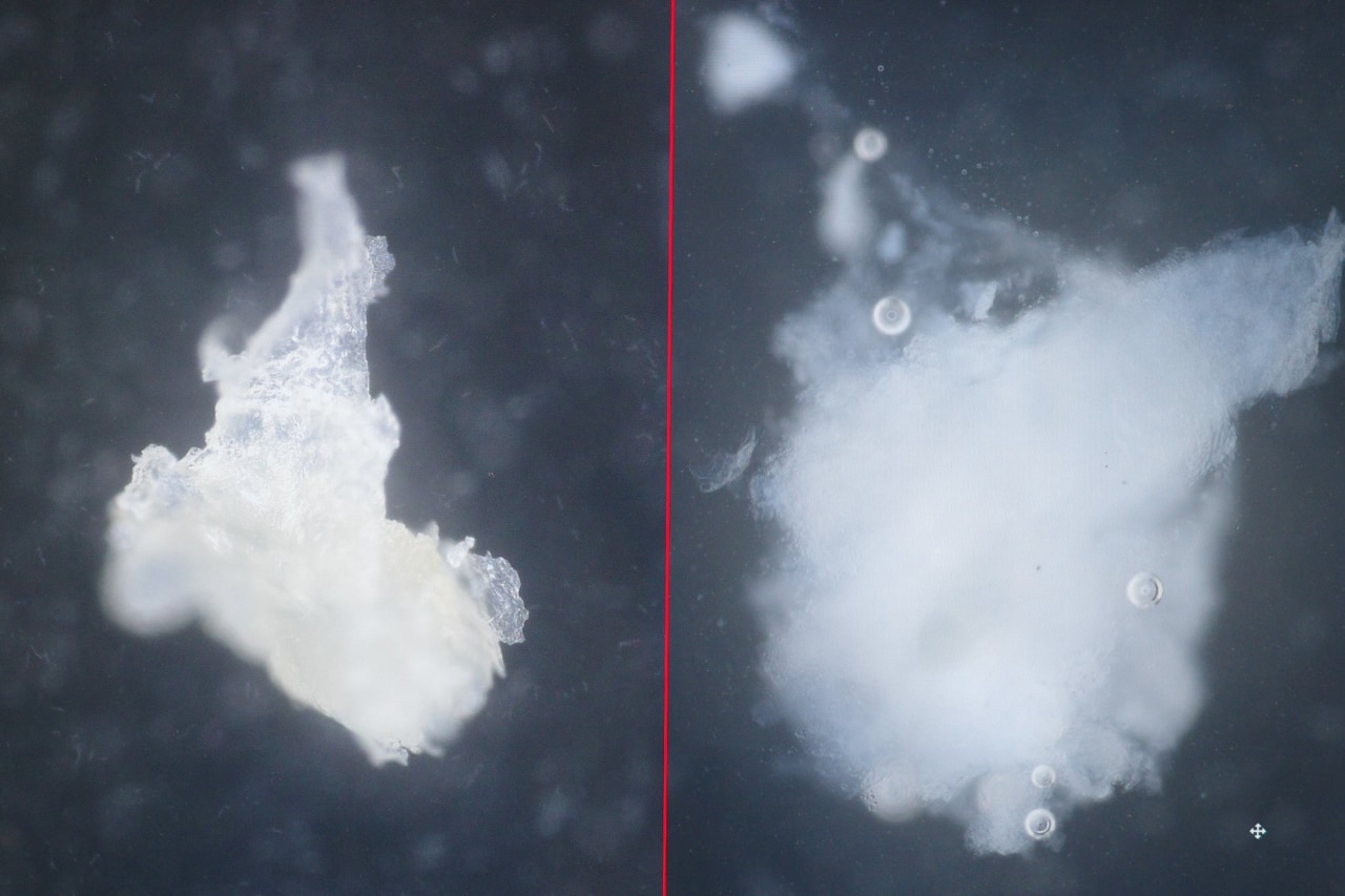 左:元の角栓、右:エスト新洗顔料と水を加えた角栓