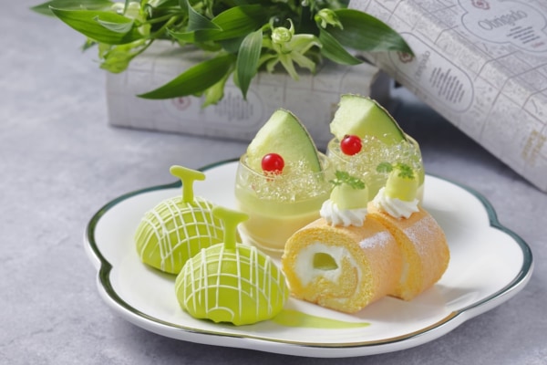 ひんやりとしたゼリーなどを重ねた3層仕立ての「メロンヴェリーヌ」、甘さ控えめのクリームがメロンの爽やかさを引き立てる「メロンロール」、マスクメロンならではの網目模様をあしらった「メロンムース」を用意。みずみずしい果実感を生かした、軽やかな味わいのスイーツが並びます。