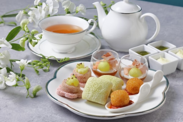 マスクメロンの爽やかな甘みを取り入れたセイボリーを用意。春らしくアレンジを加えた「生ハムと桜ブレッドのカナッペ」、メロン風味のスコーンなど、アフタヌーンティー全体にアクセントを添える品々が揃います。