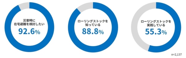 「災害時に在宅避難を検討したい」と回答した人は92.6%に上りました。在宅避難の備えとして効果的な「ローリングストック」の認知度は88.8%に達する一方で、「備蓄量が分からない」「揃えて購入が面倒・手間」といった理由から、実践している人は55.3%にとどまる現状が明らかになりました。