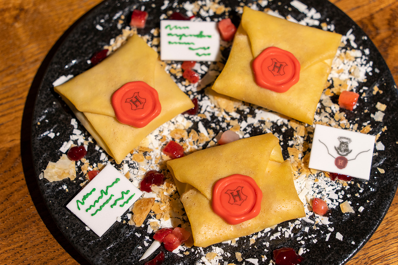 スタジオツアー東京では、ハリー・ポッターの世界観を表現した限定フードを味わうのもお忘れなく。特別企画「ホグワーツからの招待状」期間中は映画『ハリー・ポッターと賢者の石』の名場面にちなんだスイーツやグルメが登場しています。バックロットカフェの「入学許可証のクレープ(1,800円)」は、SNS映えも抜群!