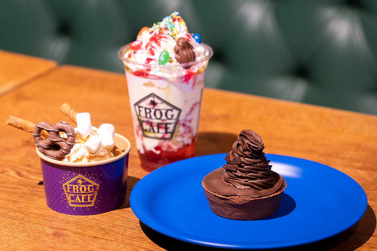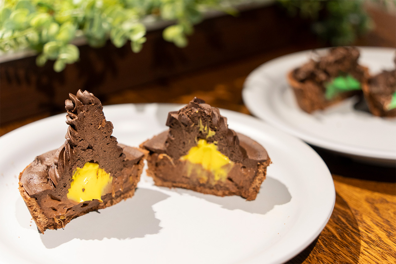 限定グルメの中でも、特に注目して欲しいのはフロッグカフェの「組分け帽子チョコレートタルト(550円)」。クリームの中にグリフィンドール・ハッフルパフ・レイブンクロー・スリザリンのいずれかの寮を表現する色のカスタードクリームが入っていて、「組分けの儀式」をスイーツで体験できるんです。