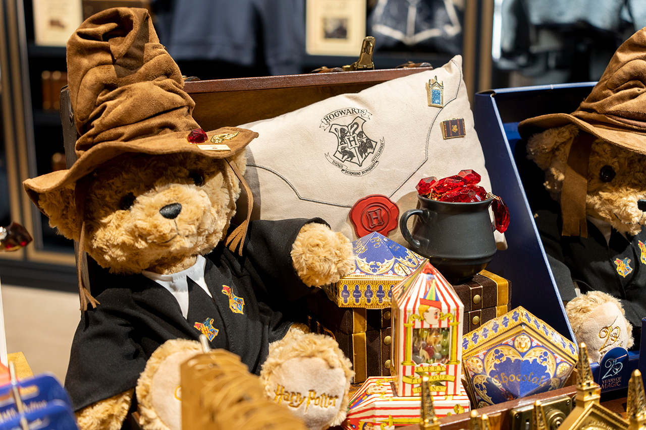 例えば組分け帽子を被った「『ハリー・ポッターと賢者の石』公開25周年記念 ベア(7,000円)」は、自分への贈り物として買いたい特別なアイテム。キラキラ煌めく赤い「賢者の石 キーチェーン(1,200円)」は、「不老不死になれるかも……!」なんて妄想も楽しめちゃいます。