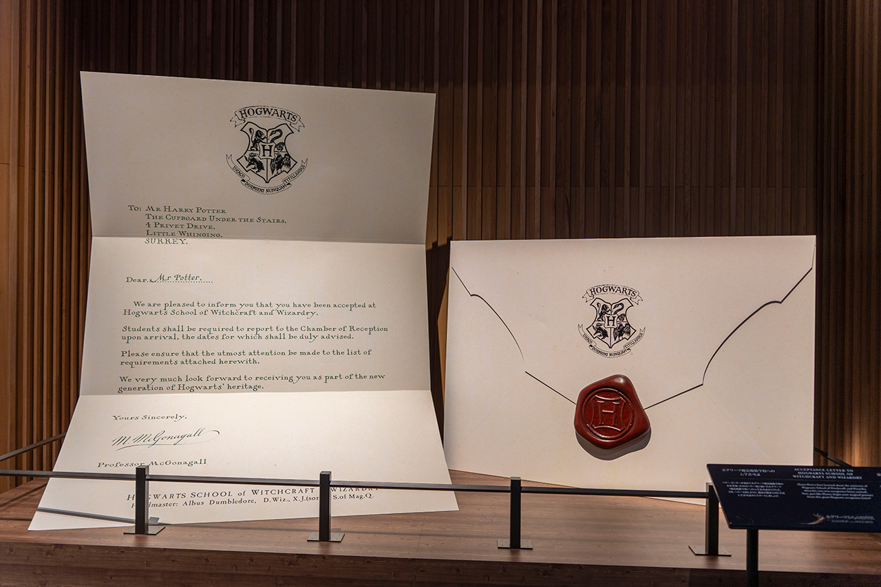 最初にロビーで出迎えてくれるのは、大きな「ホグワーツ魔法魔術学校の入学許可証」! 映画の冒頭で、階段下の物置にいるハリー宛てに手紙が届きましたよね。その封筒に入っていたのが、入学許可証です。ここから、ハリーの壮大な冒険はスタート。映画では手紙の内容をゆっくり読むことはできませんが、スタジオツアーではマクゴナガル先生の署名など細部まで確認できますよ。