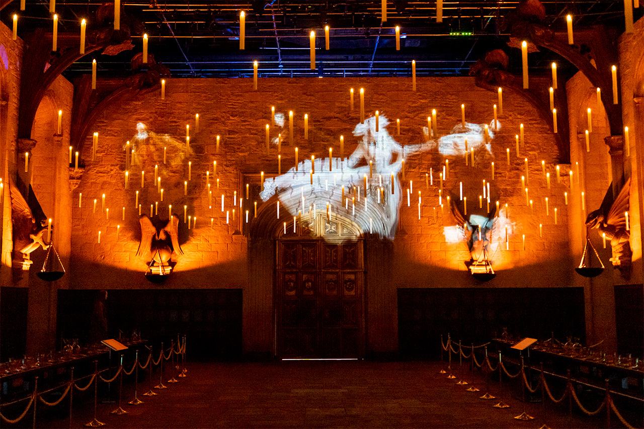 組分けの儀式後、大広間の後ろを振り返ると入学式でハリーたちを驚かせたホグワーツのゴーストたちがプロジェクションマッピングで登場! 宙に浮かぶキャンドルも、とっても幻想的です。大広間は映画で何度も登場し、最初に作られた最も古いセットの一つ。映画を1回でも見たことがある人なら、ここに立つだけでテンションが上がるはずです……! 友達と一緒にローブを着て、写真を撮るのもいいですね。