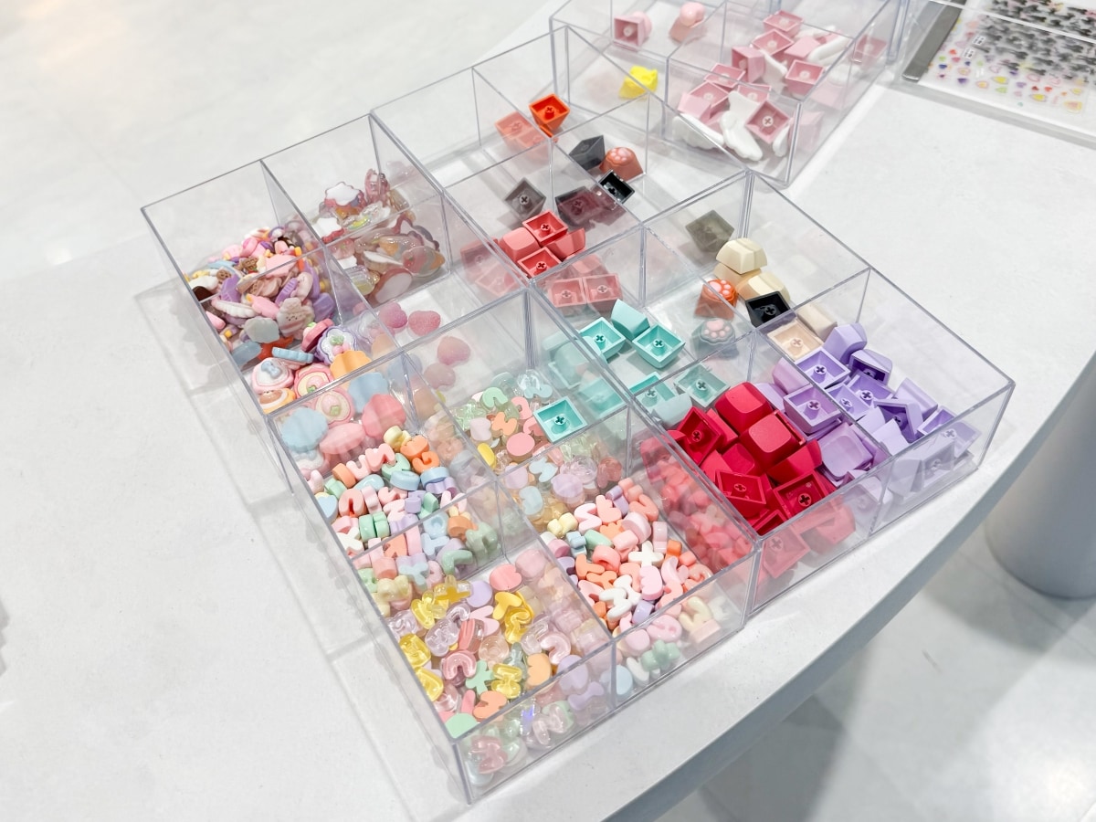 内覧会では、特別にキーボード型キーホルダーづくりを体験させていただきました。ボンドロ風やキラキラなど平成っぽいパーツが多く、大人こそときめく体験に! 好みのパーツを組み合わせて、自分だけのキーホルダーを作ってみてくださいね。
