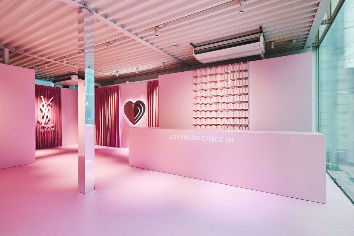 「YSL LOVENUDE HOTEL TOKYO SECRET CHECK-IN」の会場となるのは、東京メトロ明治神宮前<原宿>駅から徒歩5分ほど、表参道駅から徒歩10分ほどのキャットストリート沿いにあるクレインズ6142。会場に入るとピンクヌードカラーに染まった空間が広がり、一気に胸が高鳴ります。