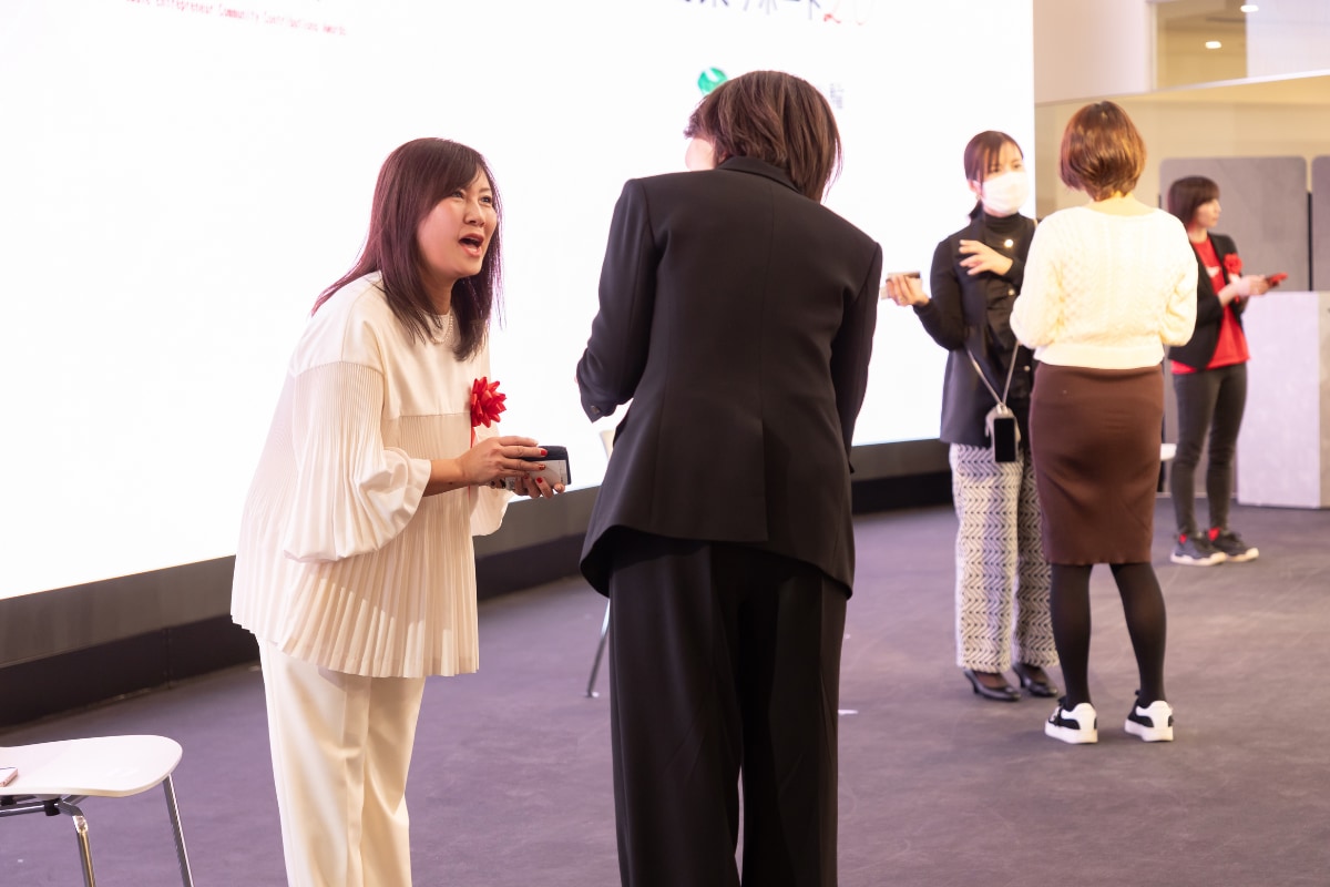 最後は、今回の受賞者と池原さんが登壇し、会場に訪れた方々との交流セッションが行われました。これから創業を考えている方たちが、センパイ女性経営者たちにご自身の事業を紹介したり、アドバイスを受けたりと交流を楽しんでいました。次世代を担う女性リーダーたちが繋がる場となり、女性活躍の輪がますます広がる良いきっかけになったようです。